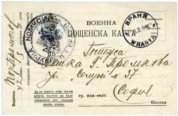 Bulgaria – Occupation of Serbia: 1916 (28 March). Formular card to Sofia struck by WRANJA (now Vranje) datestamp and censor cachet.