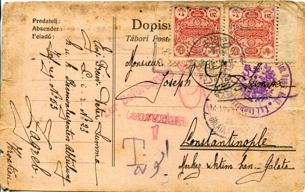 Austrian Military Post – Croatia – Ottoman Empire: 1916 (28 December). Feldpost formular card to Istanbul by an Austrian soldier serving on Zagreb, Croatia written in French but without franking taxed on arrival with pair of 20pa of 1914 issue for twenty paras postage and twenty paras tax tied by Galata arrival cds’s. Red Austrian and black rectangular Ottoman censors and blue regiment’s hand cachets. Sender probably thought military mail was post free however this was only for Ottoman soldiers inside the empire but not for other nation’s soldiers.