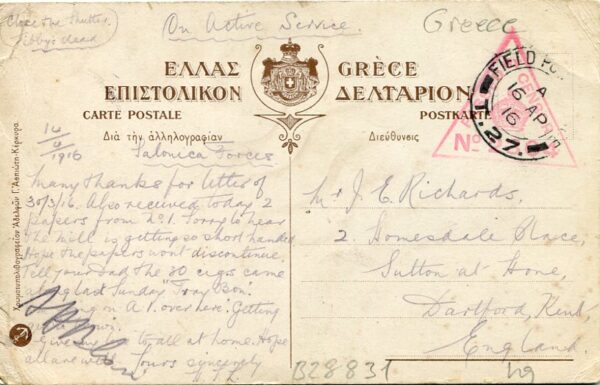 Great Britain: 1916 (16 April). On Active Service postcard to England struck by Field Post Office T.27 datestamp and red censor cachet. It was located in Salonica at that time