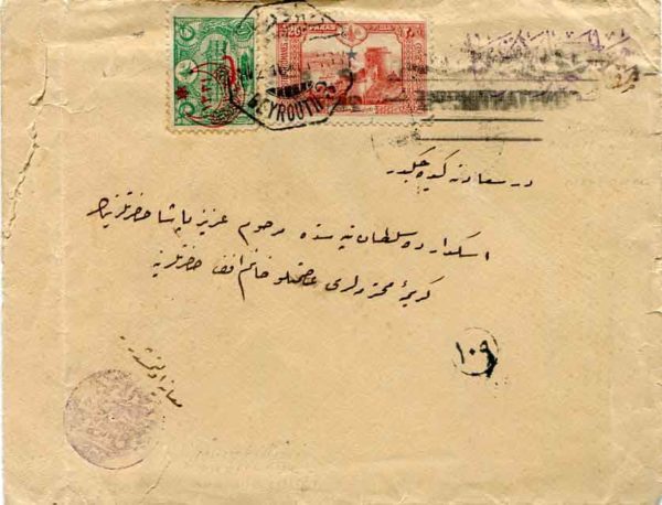 Ottoman Lebanon: 1916 (20 February). Cover with its contents to Istanbul franked with 20pa pictorial and 10pa war orphans tax overprinted stamp tied by Beyrut – Beyrouth 3 (A&P type 27, RR) bilingual datestamp and violet Mücahidin-i Mevleviyye Kumandanlığı (Mawlawi Warriors Command) negative seal. Reverse 26 February Constantinople machine cancel and 27 February Istanbul 1 arrival cds. Small tear on top left