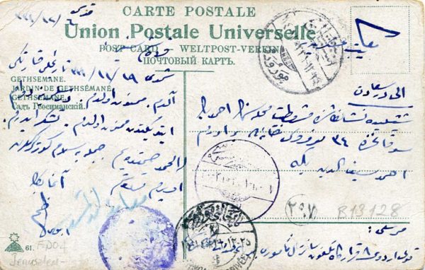 Ottoman Palestine: 1916 (6 February). Gethsemane Garden postcard written on 1st of February but posted on 6th to Istanbul struck by unreadable violet Sahra Postasi (Field Post Office) negative seal and 8 & 9 March Istanbul arrival cds’s. It is send from Jerusalem therefore most probably it is FPO4.