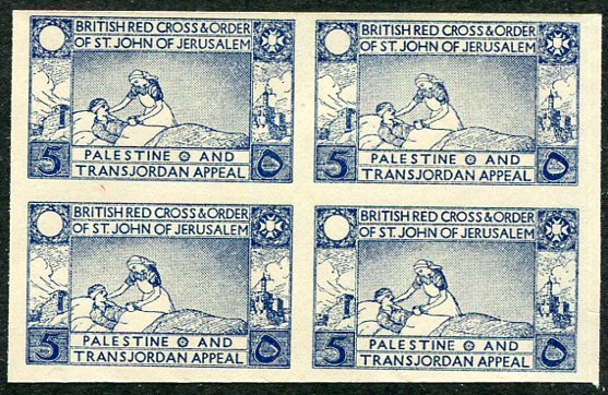 Palestine: 1916 British Red Cross Palestine and Transjordan Appeal 5f unmounted mint imperf block of four unfinished proof charity stamp. **