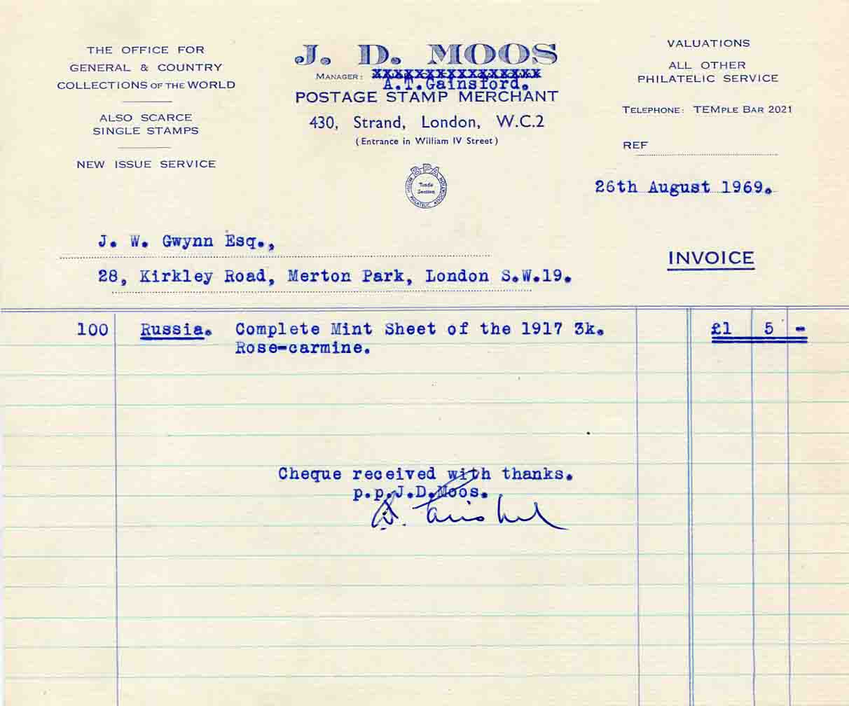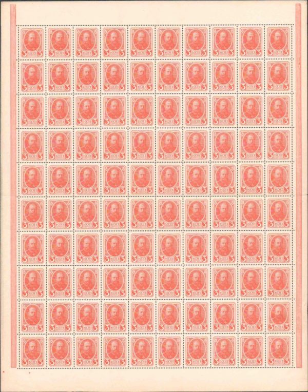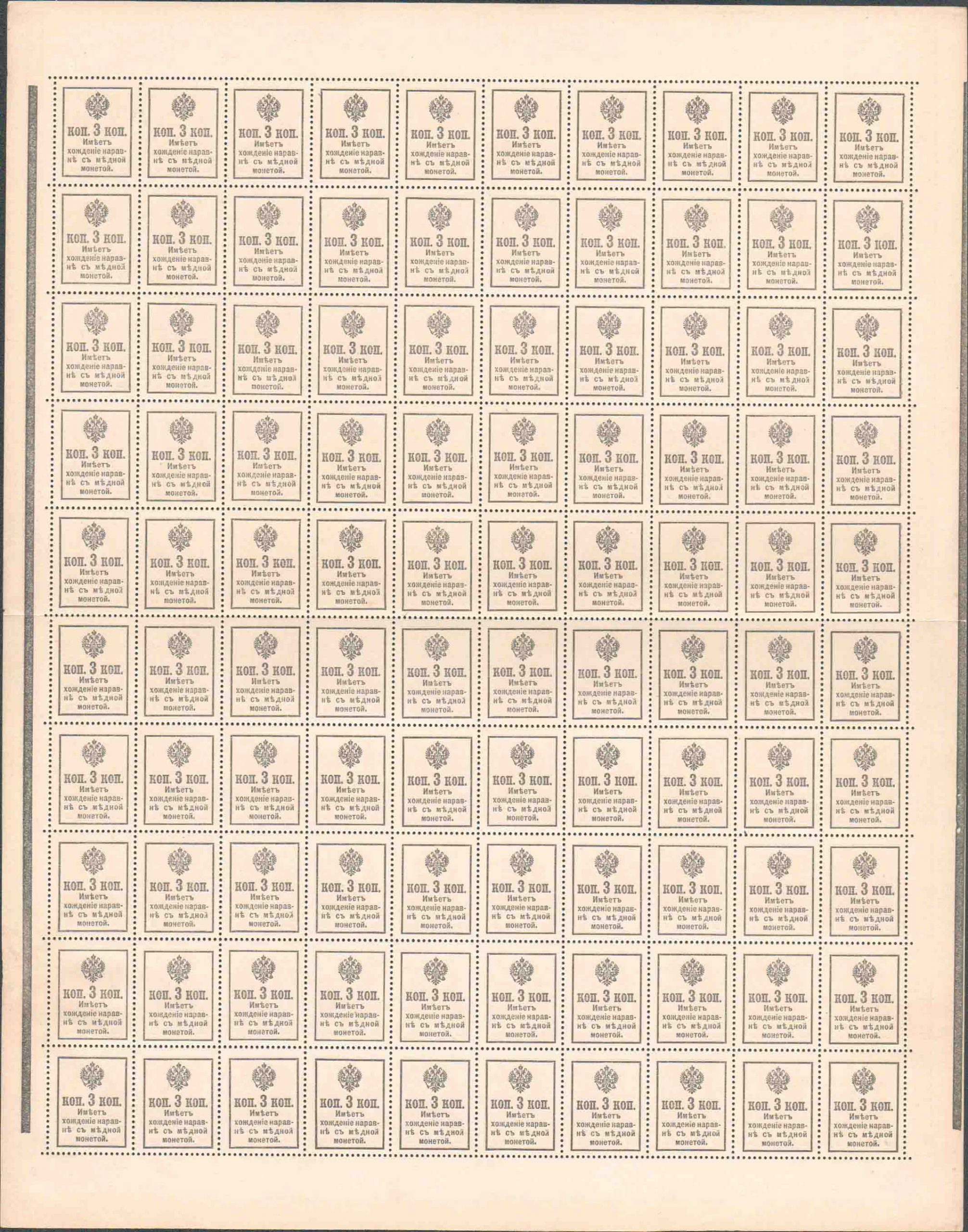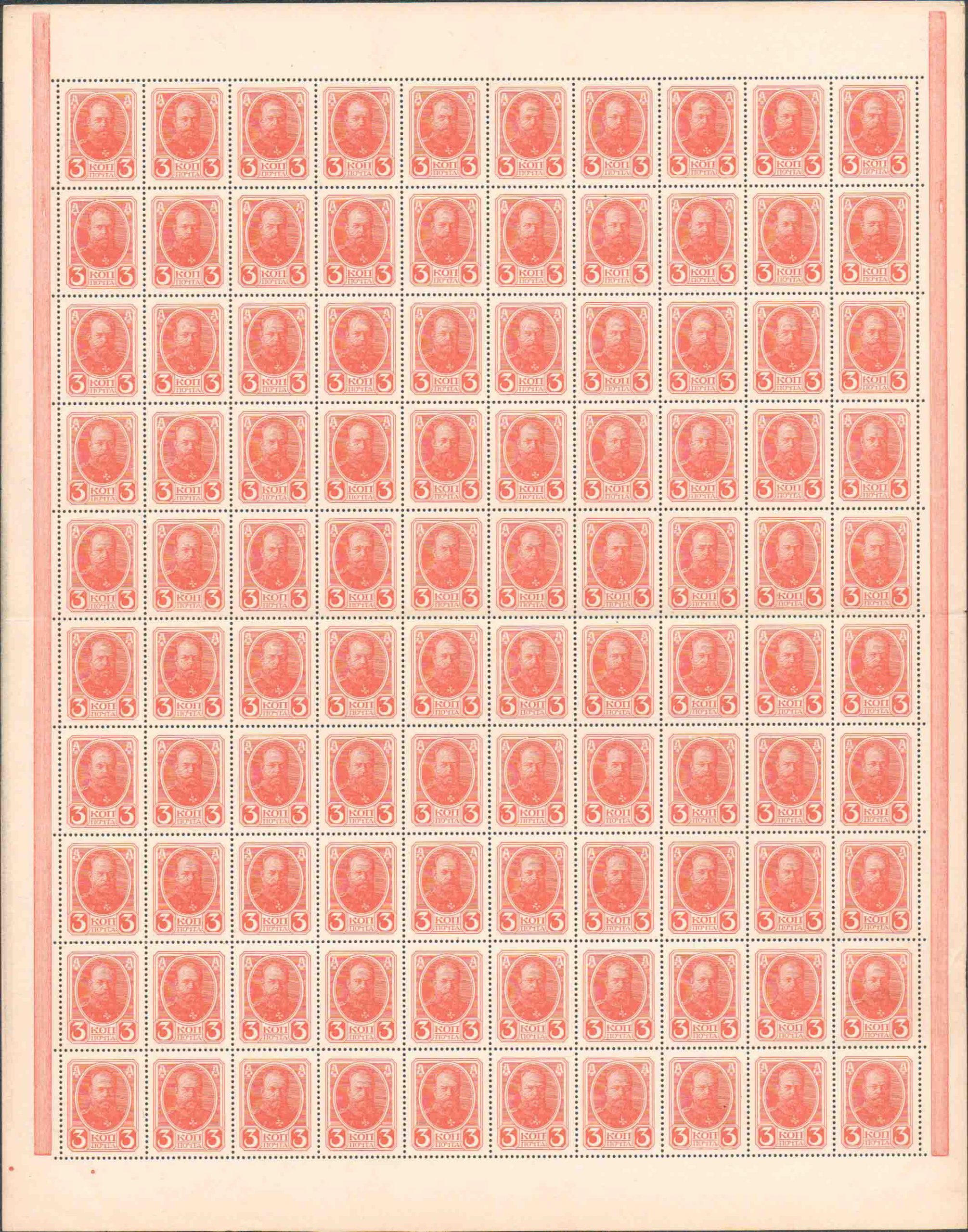 Russia: 1916. Currency stamps, the second issue 3k red thin cardboard withoout gum, perf 13 1/4 complete sheet of 100. Also 1969 original purchase invoice. SG 174, Zagorsky C6