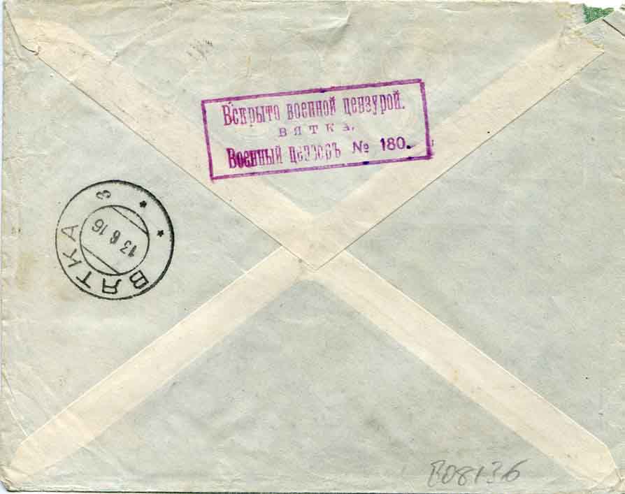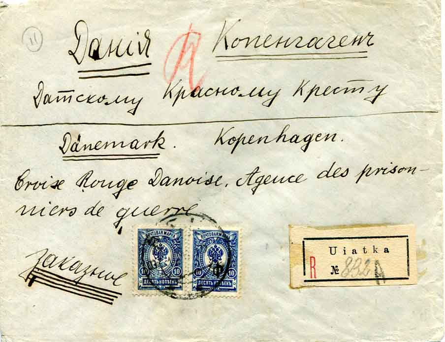Russia: 1916 (13 July). Registered cover to Red Cross PoW agency at Copenhagen franked with pair of  10k and tied by VYATKA datestamps and Uiatka registration label. Reverse repeat of the dispatch cds an rather rare Vyatka censor cachet. ex Mishkin
