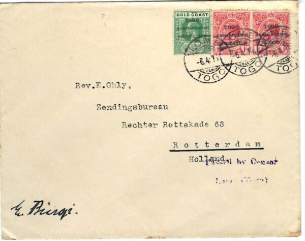 Togo (Anglo – French Occupation) : 1916 (6.4.) cover to Rotterdam, Holland franked overprinted ½d. and two 1d. tied by Lome togo cds, three-line local violet censor handstamp, arrival backstamp.