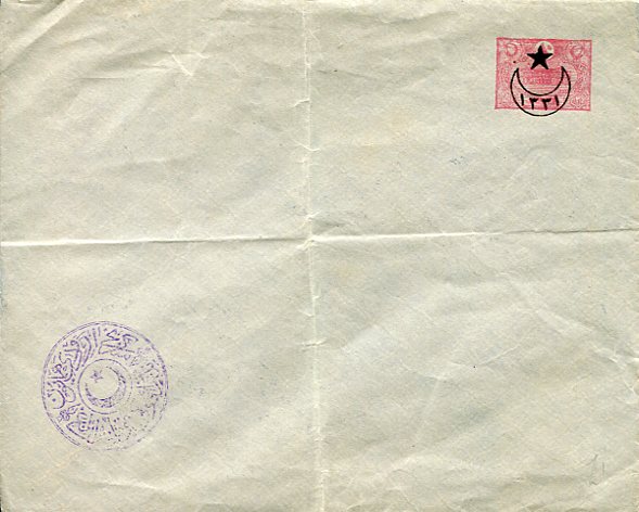 Ottoman Empire: 1916 unused thin five pointed star & crescent overprinted 20pa postal stationery envelope struck by 8. Orduyu Hümayun Telgraf Bölügü Kumandanligi (8th Army Telegraph Division Commandenment) handcachet. Isfila AN149a