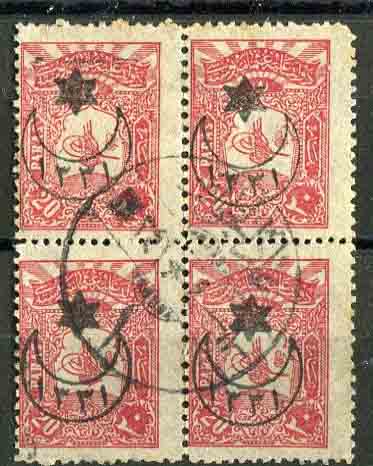 Ottoman Turkey: 1916 block of four 20pa war overprint stamps struck by previously unrecorded type superb AD ELCEVAZ 1 [vilayet Van] (unrecorded by A&P) datestamp.