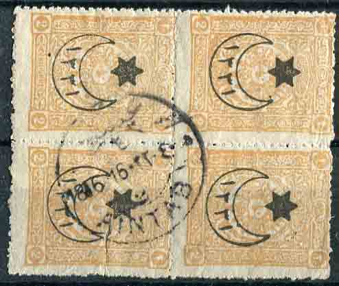 Ottoman Turkey: 1916 (16 June). Block of four 2pi war overprinted stamp struck by AYNTAB – AINTAB 2 (vilayet Halep, TR592, A&P type 9) bi-lingual datestamp.