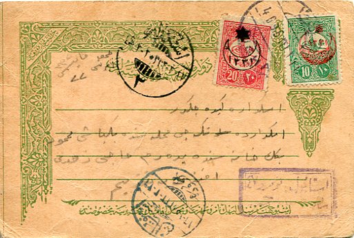 Ottoman Turkey: 1916 (3 June). Postal stationery card to Istanbul franked with 10pa and 20pa war overprint stamps tied by BIGA – BIGHA (sandjak Biga, A&P type 2) datestamp, 8 June Istanbul Mevrude [arrival] and 9 June ÜSKÜDAR 2 (A&P type 16, R) cds’s and Istanbul 47 censor cachet.