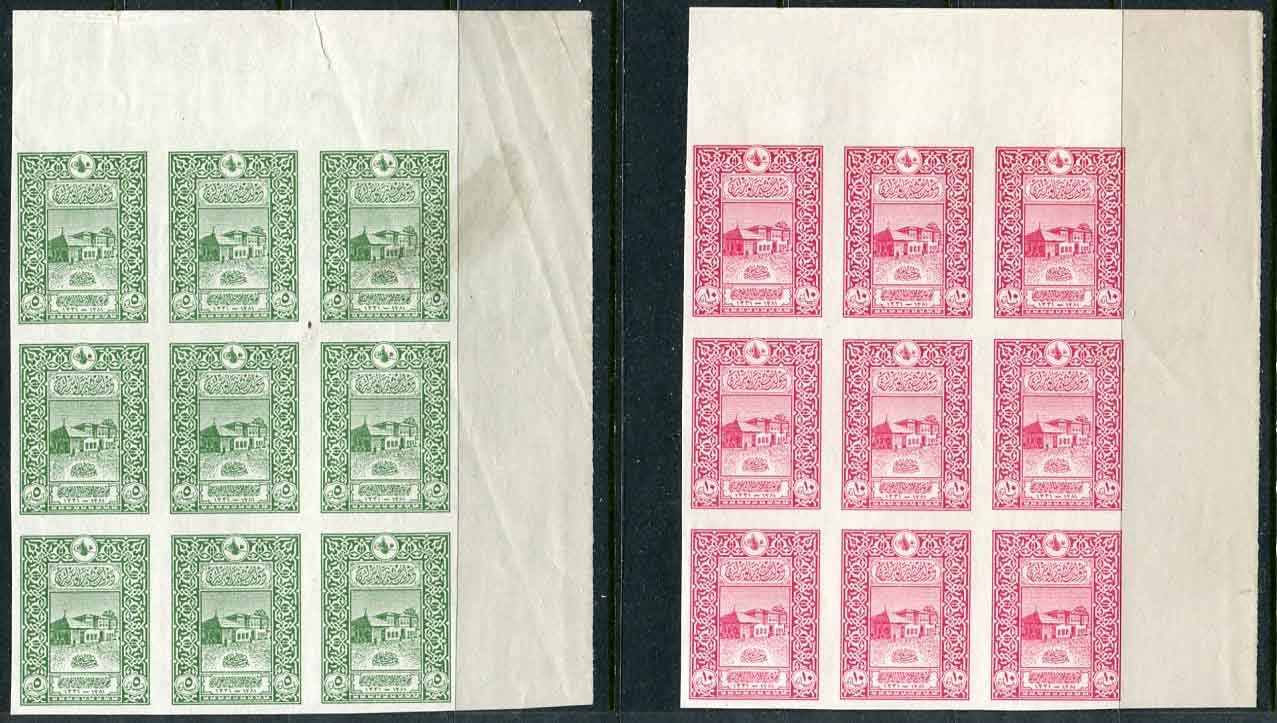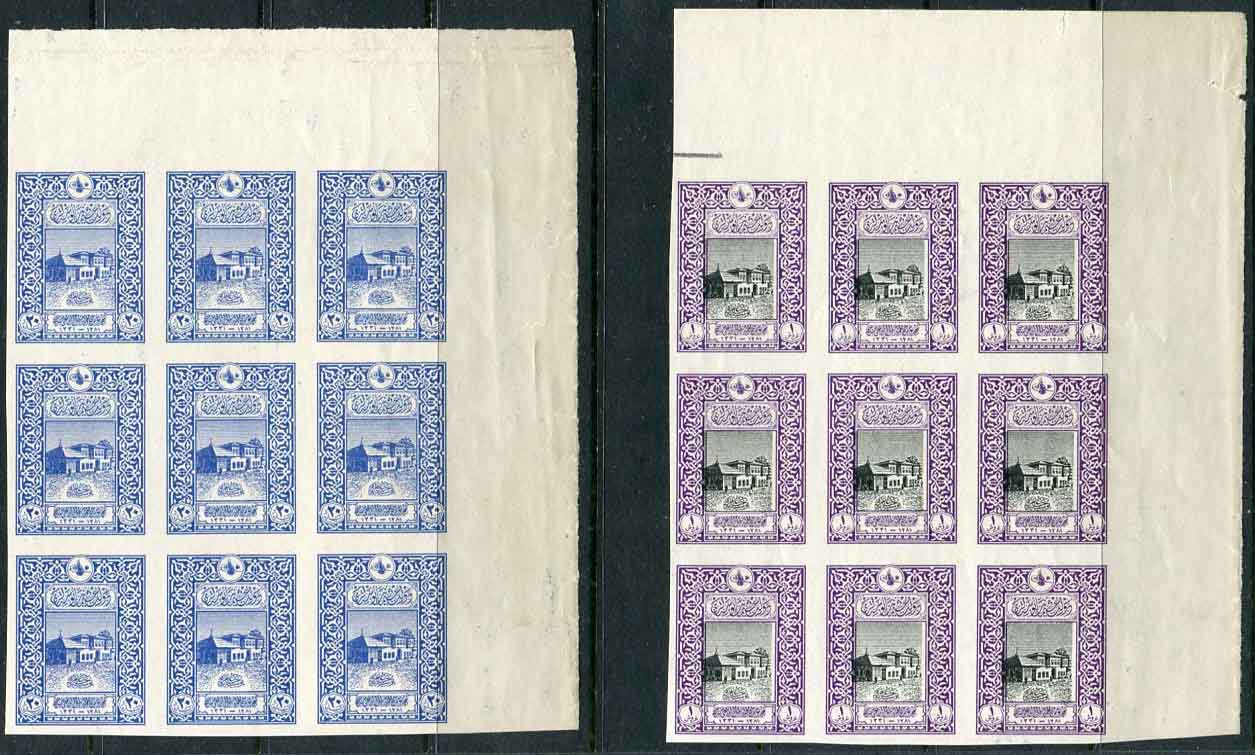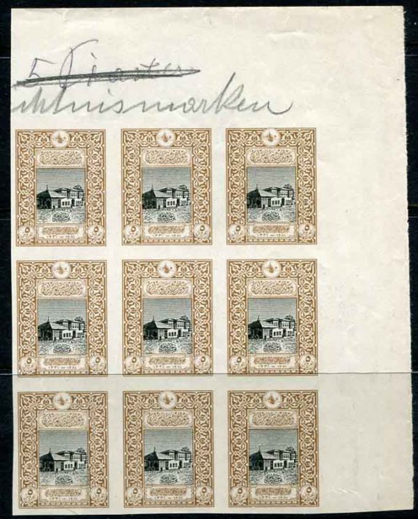Ottoman: 1916 (29 March). 50th anniversary of Constantinople City Post set of five unmounted mint corner imperforate block of nine . One of the two largest multiple recorded. Believed to be only one sheet of 100 printed. Isfila 702/706 DE11