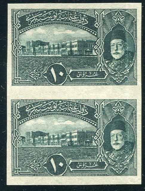 Ottoman: 1916 (15 November). Dolmabahce Palace 10pi deep green/grey unused without gum imperforate vertical pair. Isfila 712 DE11