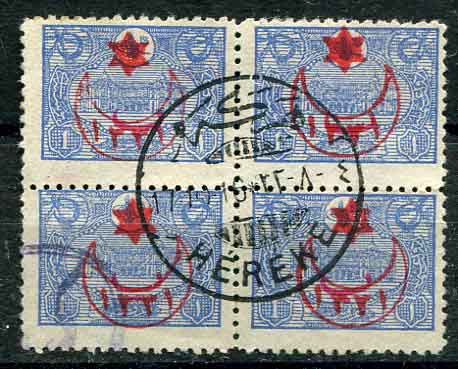 Ottoman Turkey: Block of four 1pi of 1915 war overprint issue struck by superb HEREKE (A&P type 6) 17.10.16 datestamp. Isfila 557