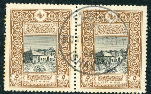 Türkiye: 1916 Anniversary of City Post 5pi pair struck by ISHAKLU – ISHAKLOU (vilayet Konya, A&P type 2, TR #2798, R) datestamp.