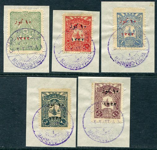Ottoman Empire: 1916 (23 July). National Fete overprinted commemorative issue individually on piece struck by matching 14 October Mahmoud-Pacha 1 Stamboul CTO datestamps. Isfila 707/711