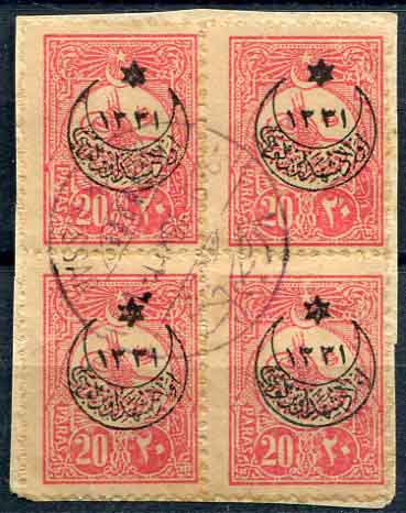 Ottoman Turkey: Block of four 20pa war orphans tax overprinted issue of 1915 on piece struck by PINARHISAR – POUNAR-HISSAR (A&P type 3, vilayet Edirne) bilingual 3.9.16 datestamp. Isfila 575