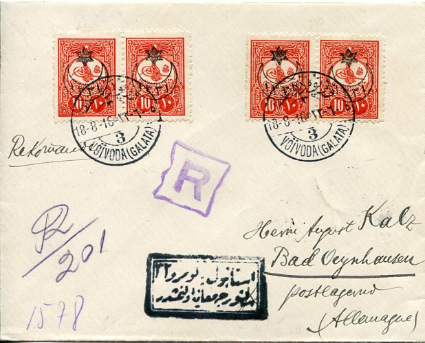 Ottoman Turkey: 1916 (18 August). Registered philatelic cover to Germany franked with two pairs of 10pi perf. 12 war overprint stamp (isfila 536 – Sg. 567) tied by Voivoda (Galata) 3 datestamp and Istanbul 32 censor cachet. Reverse same day dispatch and 23 August Bad Oeynhausen arrival cds’s.