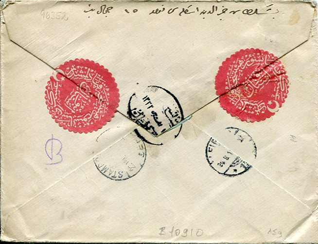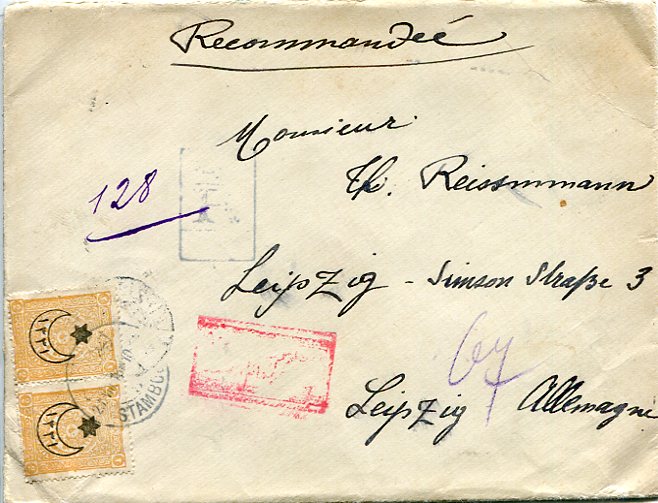 Ottoman Turkey: 1916 (23 August). Registered censored cover to Germany franked with pair of 2pi of 1915 war overprint on 1892 stamps tied by Satmboul 3 datestamps. Reverse same day Stamboul Depart and 30 August Leipzig arrival cds’s. Censored and re-sealed by two red labels.
