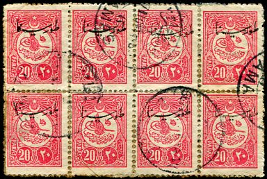 Ottoman Empire: 1916 (3 March). Tur-u Sina overprinted commemorative issue on 20pa of 1910 Sultan Reshad tughra issue block of eight struck by .. July 1916 ŞAM – DAMAS 6 (vilayet Syria, A&P type 18, RR) datestamps. ex. Ozand. Isfila 699