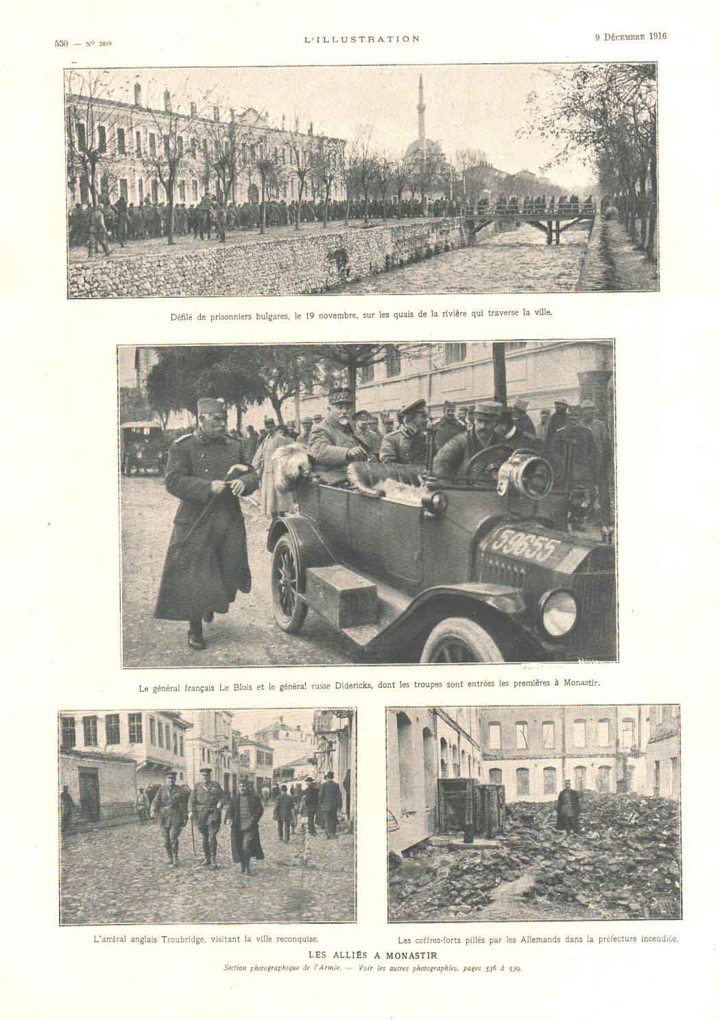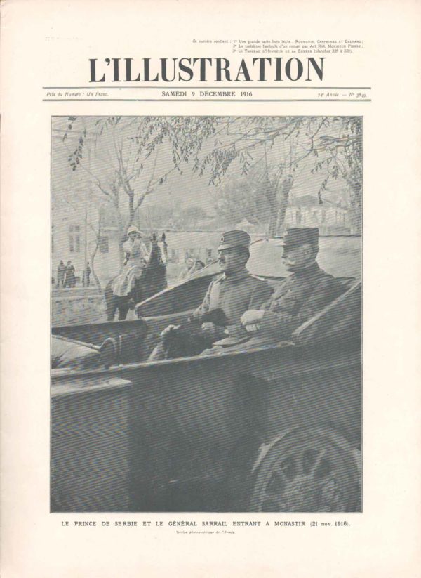Yugoslavia: 1916 (9 December). French L’Illustration magazine article of Serbian Prince and French General entry to Monastir, Romanian Front and a folded map (620 x 400mm) of Carphats, Romania and Balkans with several photographs inside. 400 x 310 mm.