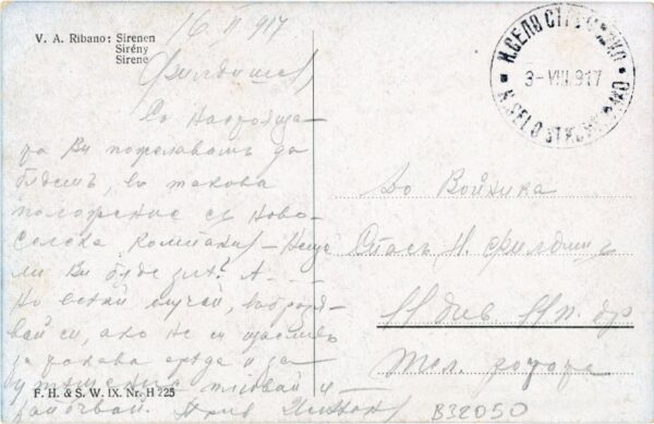 Bulgaria – Occupation of Serbia: 1917 (3 August). Art postcard addressed to Field Post Office 11 struck by N. SELO STRUMISHKO (now Strumica) datestamp.