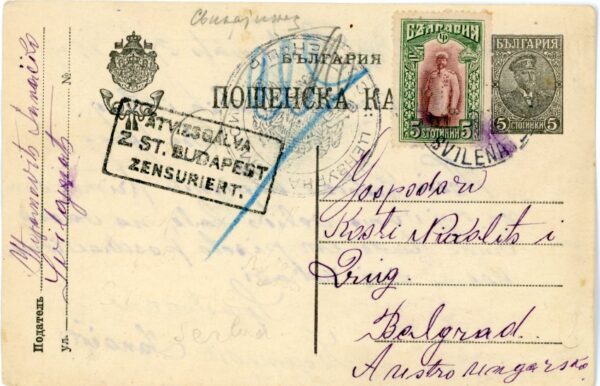 Bulgaria – Occupation of Serbia: 1917 (25 June). 5st. postal stationery card additionally franked with 5st. to Belgrade tied by SVILENATZ (now Svilajnac) datestamp Bulgarian and Budapest censor cachets