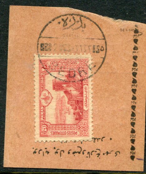 Iraq – Ottoman Post Offices: 20pa of 1914 pictorial on piece stamp struck by superb BEDRE – BÉDRÉ (vilayet Baghdad, IRQ #55, A&P type 1, RRR) datestamp. No complete document of this type up to this date recorded.