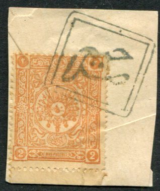 Iraq – Ottoman Post Offices: 1892 coat of arms 2pi. on piece struck by superb SALAHİYE (Kifri, vilayet Mosul, IRQ #188, A&P type 1, RR) double box handstamp. No complete document recorded up to this date with this type.