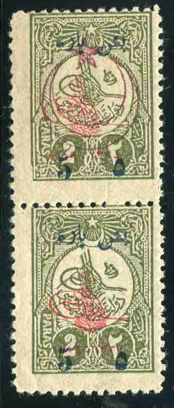 Ottoman Empire: 1917 (June). Red star & crescent overprinted to be used by officers in Military Field Post Office 5pa on 2pa surcharged printed matter stamp unmounted mint vertical pair one without overprint error. Isfila YPO218, Mi. 3