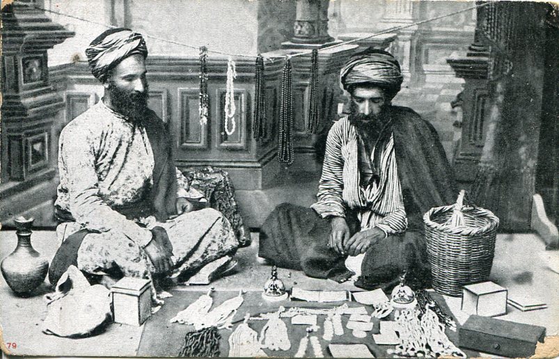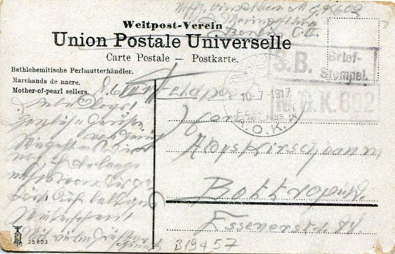 Ottoman Palestine: 1917 (10 July). Soldier postcard free from franking titled ‘Mother of pearl seller’ to Bottrop, Germany struck by DÖRDÜNCÜ ORDU HEYET-I ISLAHIYYE SAHRA POSTASI – FELDPOST MIL.MISS. AOK 4 (A&P type 128) 4th Army Field Post Office datestamp, B.B. Brief-Stempel and Machine Gun Troop (Maschinengewehrtruppe) M.G.K. 602 German military unit handcachets.