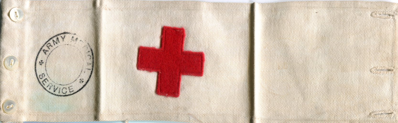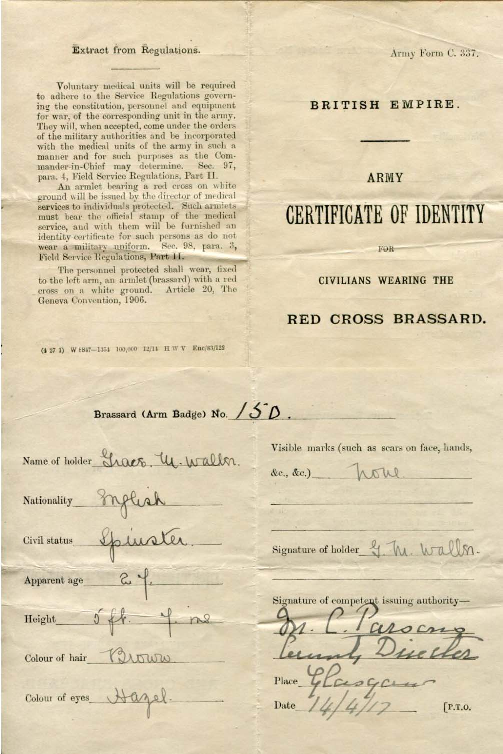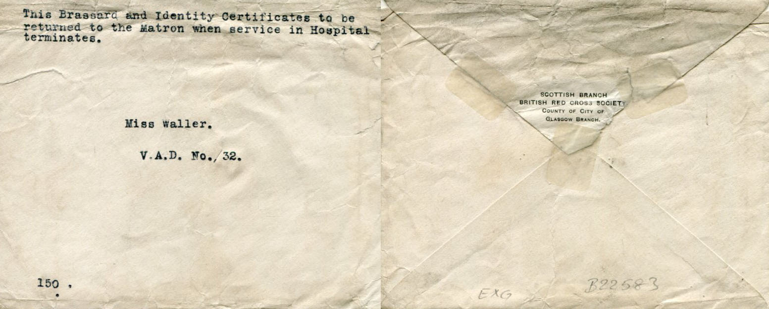Red Cross: 1917 Red Cross Arm Badge struck by ARMY MEDICAL * SERVICE cachet, Army Certificate of Identity dated 14 April and the Scottish Branch – British Red Cross Society – Glasgow Branch imprinted envelope with it. Unusual and scarce.