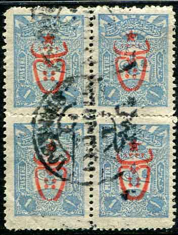 Turkey: 1917 (25 February). PTT overprinted block of four 1pi of 1905 issue tied by complete Sirkedji datestamp. Isfila 796