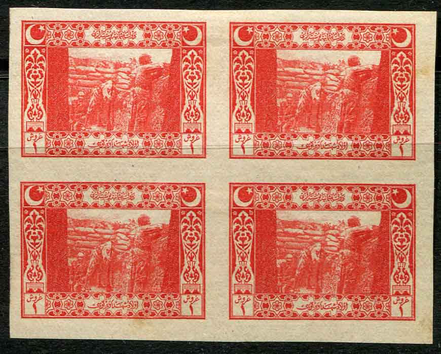 Ottoman: 1917 unissued Vienna print pictorials 1pi red Gallipoli Trenches mint o.g. imperforate block of four. A couple of brown spot also visible on front but still very rare. Isfila 868 DE11