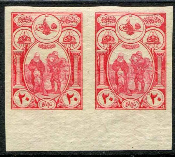 Ottoman: 1917 unissued Vienna print pictorials 20pa deep rose War Orphan Children unmounted mint bottom marginal imperforate pair. Isfila 867 DE11