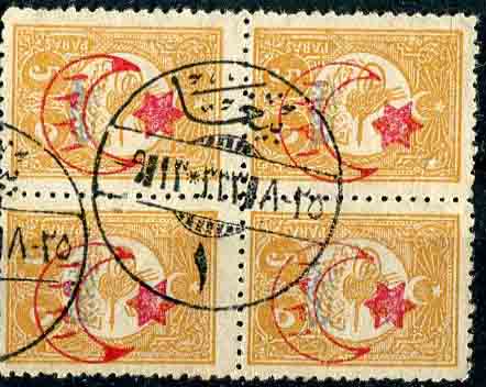 Ottoman Turkey: 1917 (7 November). Block of four 5pa war overprinted stamp struck by superb BIGA 1 (A&P type 5) datestamp.
