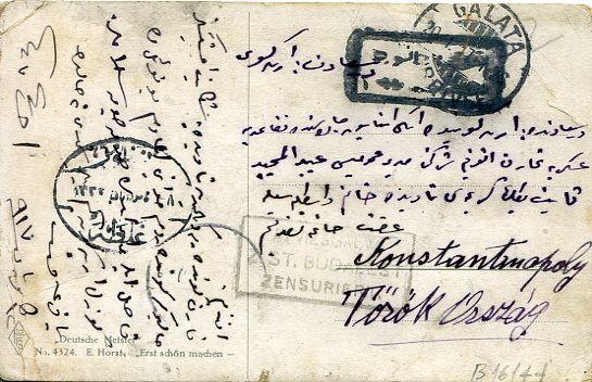 Ottoman Military – Romania: 1917 (12 January). Postcard from a soldier in Budapest Military Hospital who was fighting at the Galician Front to Istanbul struck by German censor cachet, 20 January Galata arrival cds and two Ottoman censor cachets.
