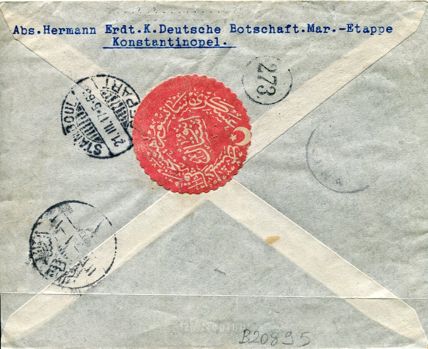 Ottoman Turkey: 1917 (21 March). Registered censored cover to Germany franked with 10pa, 20pa and 2pi of war issues for registered letter rate and war orphans tax tied by Pera 7 datestamps, boxed Istanbul censor cachet and Kaiserl Deutsches Postampt label. Reverse same day dispatch and faint Munchen arrival cds’s as well as red rosette censor label.
