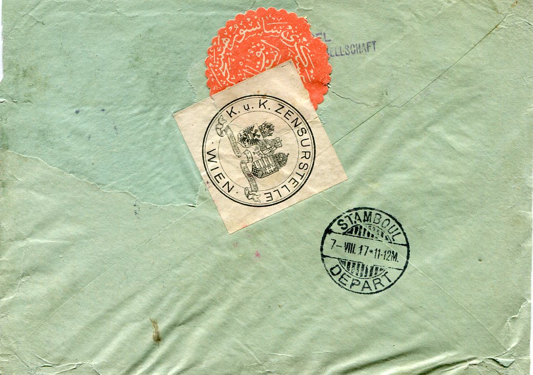 Ottoman Turkey: 1917 (7 August). Registered double censored cover to Vienna franked with pair of 5pa printed matter of 1916 war opt, 20pa war orphans tax and strip of 1pi of 1917 PTT overprint stamps tied by Stamboul 2 datestamps, Istanbul and red Austrian censor cachets as well censor labels on reverse.