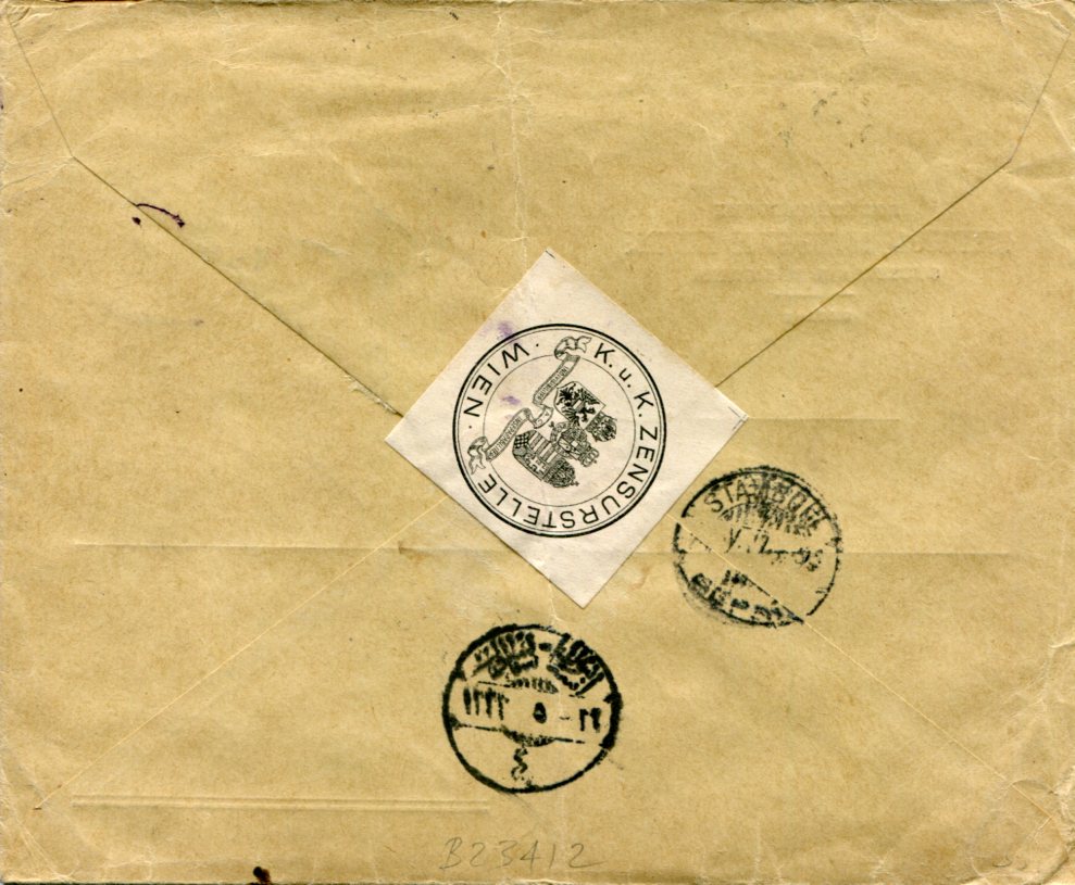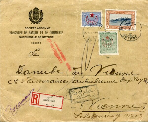 Ottoman Turkey: 1917 (22 May). Hungarian Bank imprinted registered cover to Vienna franked with 10pa and 1pi overprinted issue of 1916 and 2pi pictorial stamps tied by IZMIR – SMYRNE 12 (A&P type 91) datestamps and censor cachets. Reverse Istanbul transit cds. and Austrian censor label. Isfila 609, 682, 886