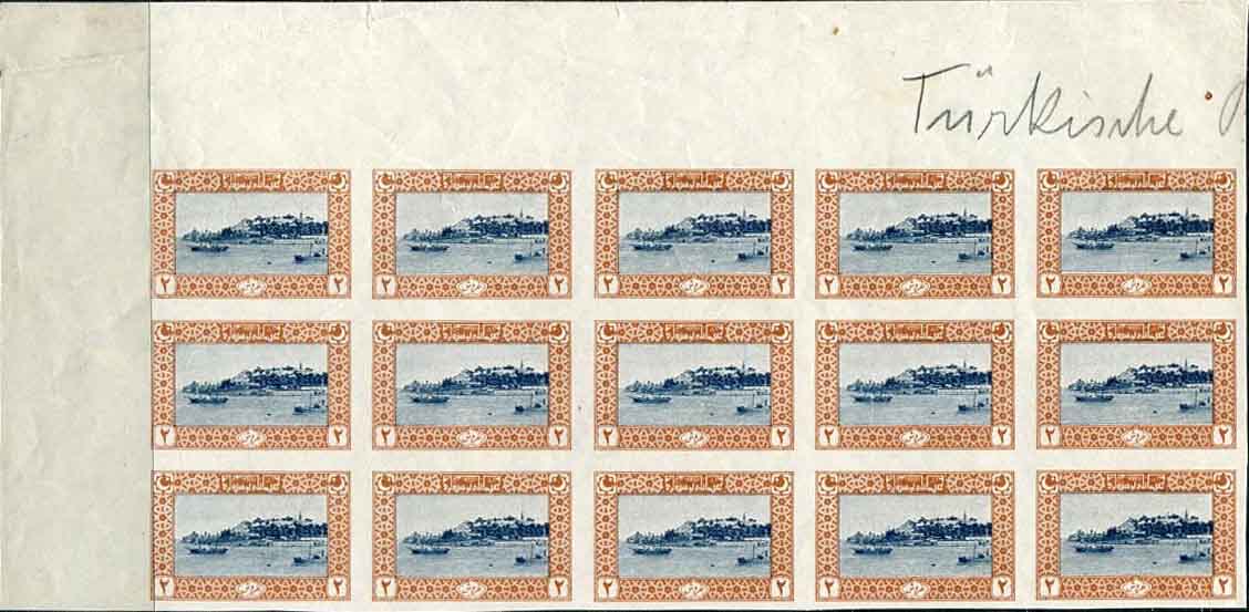 Ottoman: 1917-18. Vienna print pictorial issue 2pi unmounted mint top corner marginal imperforate block of 15. The largest multiple recorded. Only 200 printed. Isfila 886 DE11
