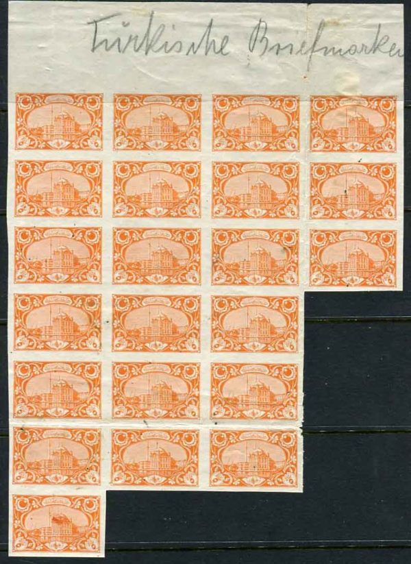 Ottoman: 1917-18. Vienna print pictorial issue 5pa orange Ortakoy Mosque unmounted mint top marginal imperforate block of 22. The largest multiple recorded. Only 200 printed. Isfila 881 DE11