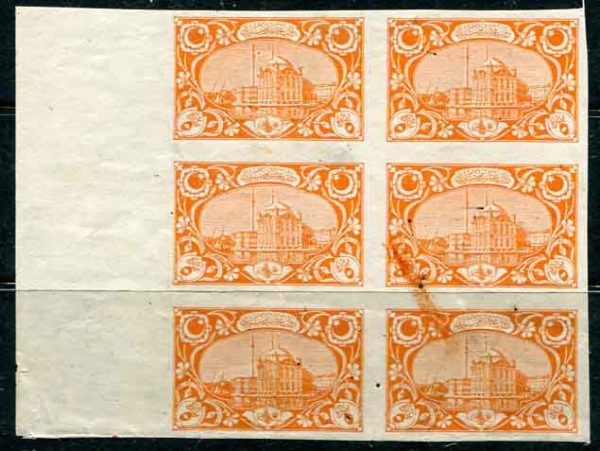 Ottoman: 1917-18. Vienna print pictorial issue 5pa orange Ortakoy Mosque unmounted mint left marginal imperforate block of 6. Only 2 sheets of 100 printed. Isfila 881 DE11