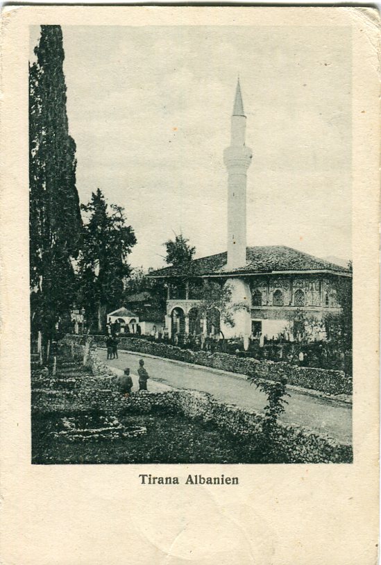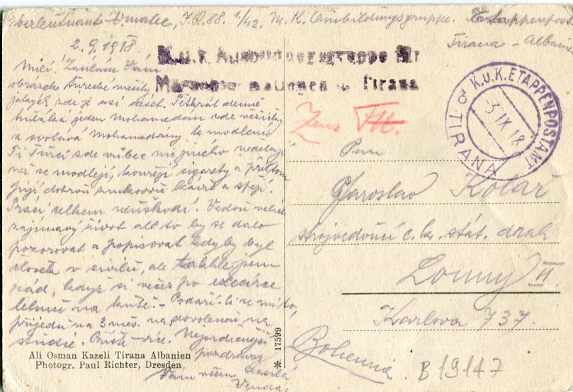 Albania: 1918 (3 September). Postcard of Tirana Mosque (ed. Ali Osman Kazeli) to Karlovo [Namesti] (Czech Republic) struck by Austrian Military Post Tirana datestamp and straight line military unit handcachet.