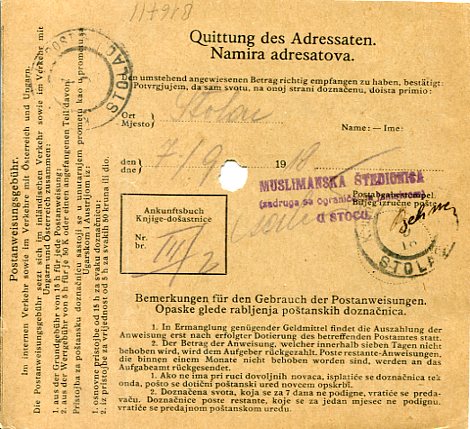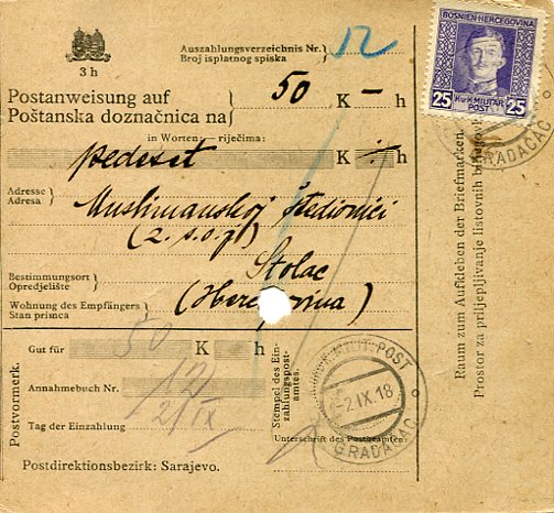 Bosnia and Herzegovina: 1918 (2 September). Money Order to Stolac franked with 25h Emperor Charles portrait tied by Austrian Military Post GRADACAC datestamps and on reverse 7 September arrival cds. Hole on the middle.