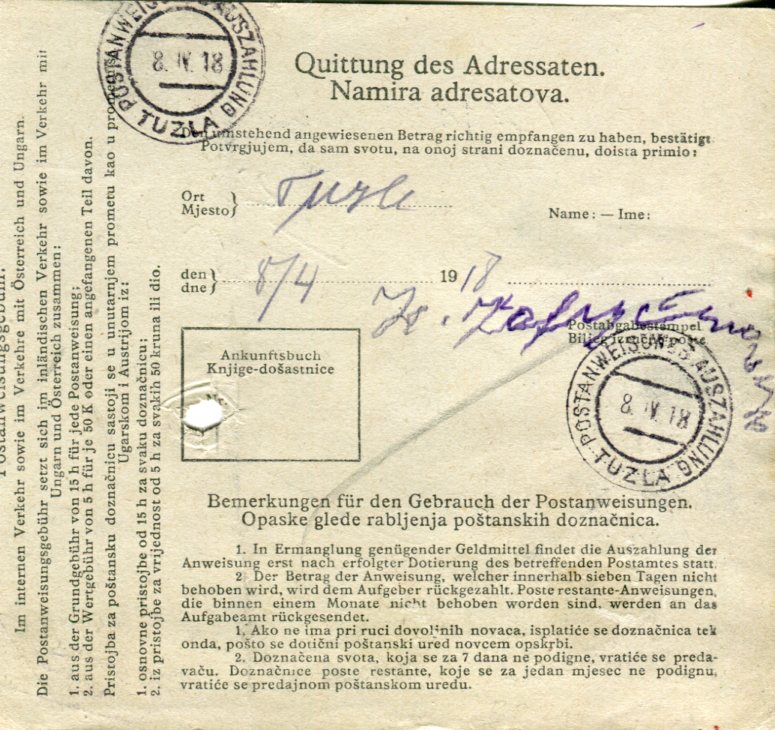1918 Bosnia Maglaj Money Order to Tuzla