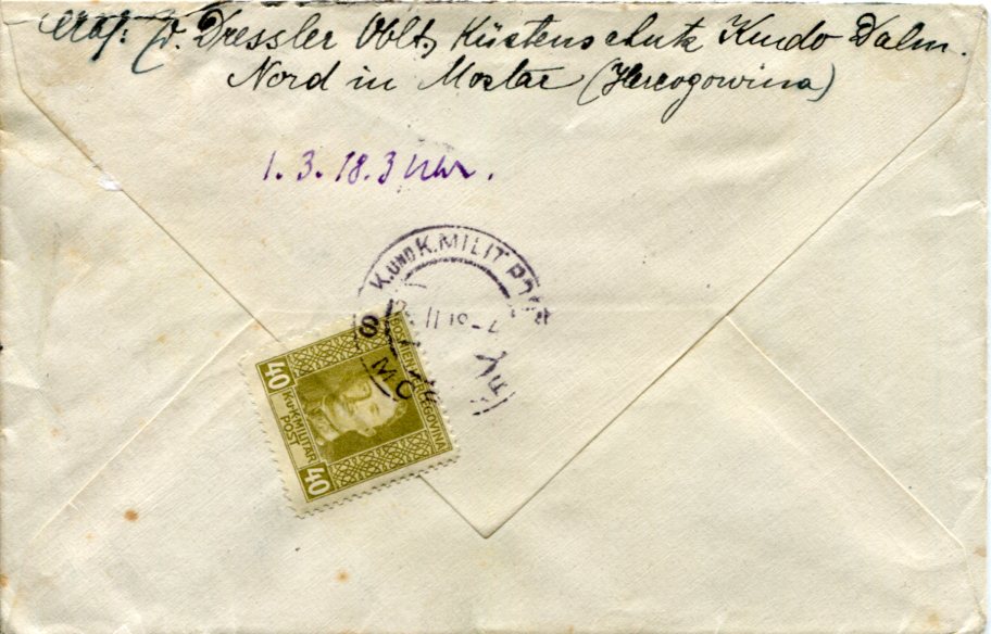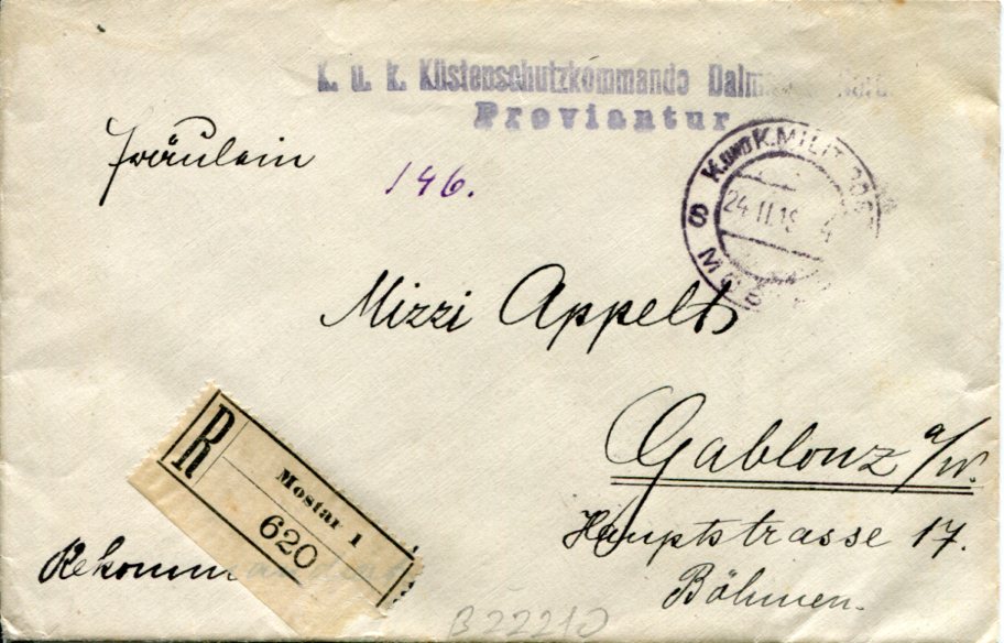 Bosnia and Herzegovina: 1918 (24 February). Registered cover to Gablonz (today in Czech Republic) franked on reverse with 40h Emperor Charles portrait stamp tied by Military Post MOSTAR datestamp. On front K.u.k. Küstenschutzkommando Dalmatien / Proviantur handcachet and repeat of dispatch cds.