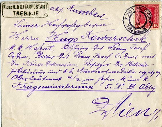 Bosnia and Herzegovina: 1918 (21 June). Cover to Austria franked with 15h Emperor Charles I definitive tied by Austrian Military Post TREBINJE datestamp and K. und K. MILITARPOSTAMP / TREBINJE boxed handcachet. Reverse no postal markings.
