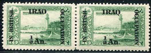 Iraq: 1918 (1 September). Ottoman pictorial stamps surcharged 1/2an on 10pa Lighthouse design mint o.g. pair one with no tail on Q of Iraq variety. Sg. 2 *