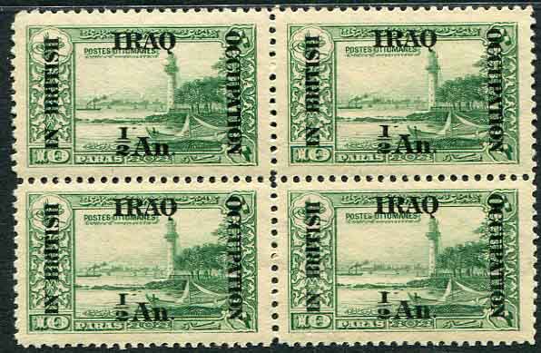 Iraq – British Occupation: 1918 (1 September). 1/2a. watermark Multi Script CA surcharged on Ottoman 10pa. Lighthouse Garden unmounted mint block of 4. Sg. 16