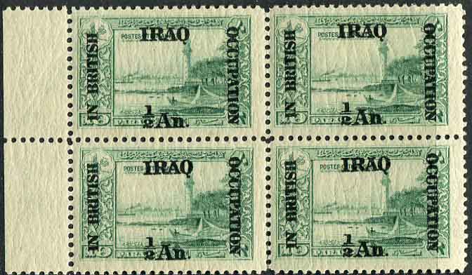 Iraq – British Occupation: 1918 (1 September). 1/2a. watermark Multi Script CA surcharged on Ottoman 10pa. Lighthouse Garden unmounted mint left marginal block of 4. Sg. 16