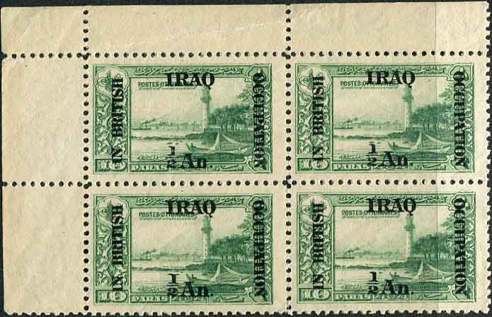 Iraq – British Occupation: 1918 (1 September). 1/2a. watermark Multi Script CA surcharged on Ottoman 10pa. Lighthouse Garden unmounted mint top right marginal corner block of 4. Sg. 16